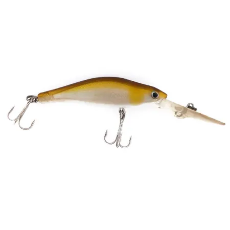 Guld- och olivbruna toner längs ryggen ger en naturlig kontrast mot de pärlvita sidorna på detta 6 cm (2 1/4") drag från Yo-Zuri/Duel. Denna 3DS Shad SR på 6 g (3/16 oz), katalogiserad under produktkod 10418, är en japantillverkad wobbler av typen suspender från Hardcore & Bass-serien. En rejäl genomskinlig sked gör att draget når djup på 0,1 - 1,5 m (0,3 - 5 fot), vilket gör det till ett mångsidigt verktyg för både spinnfiske och trolling. Exemplaret är i skick 5/5 och visar inga tecken på slitage på sin originalfinish eller de tyå originalmonterade trekrokarna. Just denna modell framhäver den precisionstillverkning som Yo-Zuri är känd för, särskilt i hur skeden är integrerad för att säkerställa stabilitet på rätt djup.