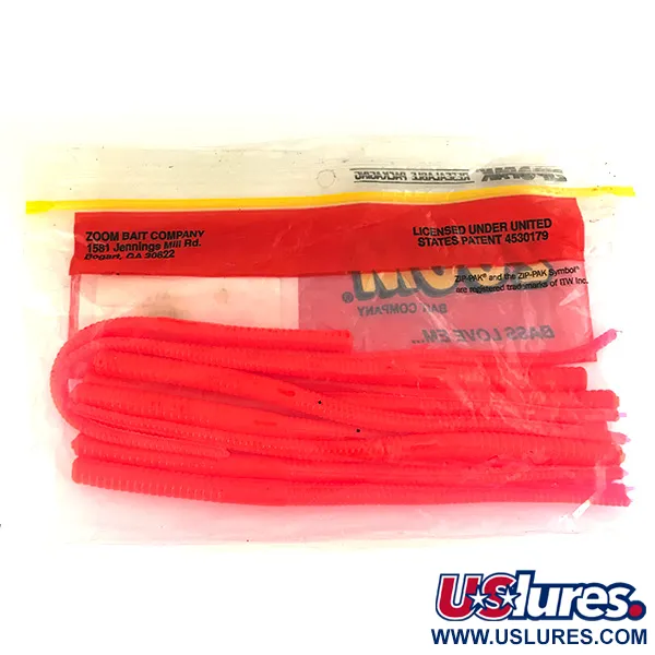 Dessa 15 cm (6") långa mjukplastmaskar representerar den klassiska finesse-profilen som har gjort Zoom Bait Company till en stapelvara i sportfiskarnas draglådor. Den högvisuella färgen Merthiolate är en specialiserad neonton som ofta används för siktfiske vid lekplatser eller i grumligt vatten där det är viktigt att kunna följa betet visuellt. Som en del av Super Salt Plus-serien är materialet kraftigt saltimpregnerat, ett designval som påverkar betets flytförmåga och textur. Denna förpackning, med produktkod 6838, innehåller 12 oanvända exemplar som behållit sin ursprungliga mjukhet och livfulla pigmentering. Tillverkad i USA, med en karaktäristisk räfflad kropp som smalnar av i en fin taper, perfekt för presentationer med tunna krokar som shaky head eller en viktlös rigg. Dessa beten är i oanvänt skick.